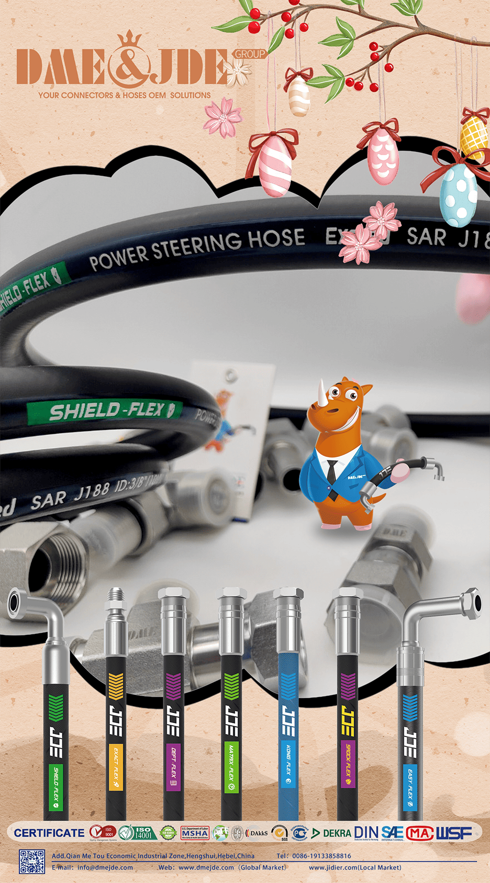 DME&JDE supplies more than 100 kinds of standard and custom flexible hoses to satisfy hydraulic and industrial fluid transfer.